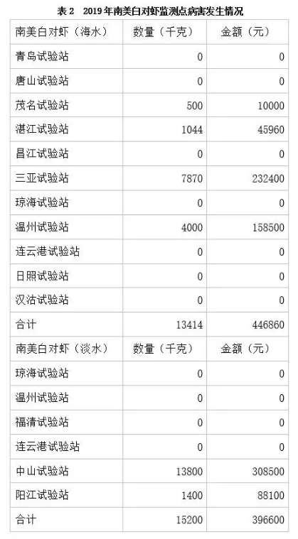 2019年虾蟹产业体系针对南美白对虾共在14个试验站设置了36个观测点,其中海水养殖11个试验站24个观测点,淡水养殖6个试验站12个观测点。根据监测数据,2019年发生病害的共有6个试验站14个观测点,基本情况如表2所示。