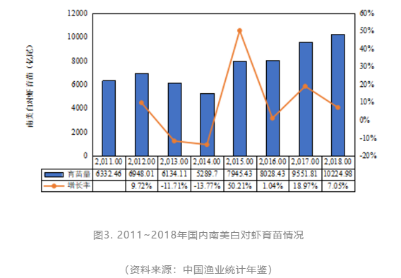 图3给出了近年来我国南美白对虾育苗情况,显示我国虾苗育种呈现较大波动。在经历2013、2014年高达11.7%、13.8%的大幅下滑后,国内南美白对虾育苗量从近7000亿尾降至5290亿尾。但随后在2015年出现反弹性暴增,增速高达50%,逼近8000亿尾大关。从2016年开始,我国南美白虾苗连续跨越八千亿、九千亿和万亿尾台阶。但是,虽然从总量而言我国对虾育苗居于世界第一,却存在着种苗质量不高、生产过程监管不力、市场混乱等问题,需要引起高度重视。