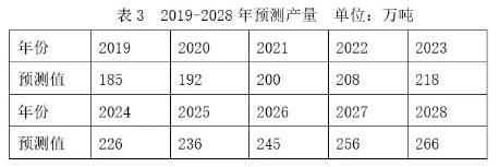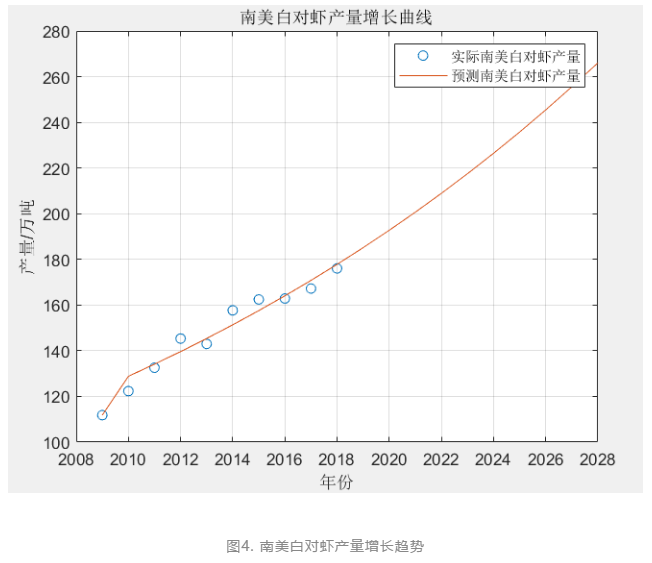 由于南美白对虾生产过程中的影响因子很多,既包括技术因素,还包括气候因素,另外还有病害等不确定性因素的影响。因此,为了使预测结果更加合理,我们选择了灰色预测GM(1,1)。在预测期间国家水产养殖政策没有重大调整,养殖不发生大面积病害,养殖品种比例各地没较大变化的前提下,以《中国渔业统计年鉴》历年南美白对虾产量为基础数据,运用Matlab预测结果见表3和图4: