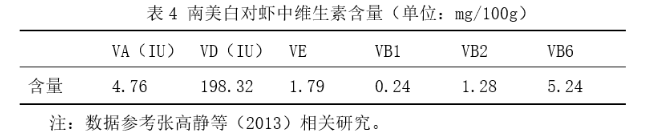南美白对虾作为一种重要的水产品,具有高蛋白(约占20%)、低脂肪的特点,含有人体必需的8种必需氨基酸和2种半必需氨基酸,属于FAO及WHO框架下优质蛋白源范畴。与此同时,南美白对虾还富含有益于人体的多种维生素及钙、铁、锌、硒等矿质(见表4所示)。