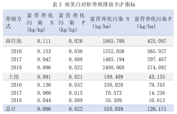 结果表明,南美白对虾养殖氮磷排放量不高。土池养殖每生产1kg南美白对虾排放90g氮、20g磷;按养殖面积计算1亩水面排放12.6kg氮、2.9kg磷;高位池每生产1kg南美白对虾需要排放111g氮、26g磷;按养殖面积计算1亩水面排放124kg氮、28.3kg磷。土池相比高位池排放的氮磷更少。