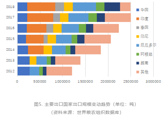 2018年,全球对虾出口规模约为249万吨,较2017年略有下降(降幅0.18%)。对虾出口前5位的国家是印度、厄瓜多尔、越南、中国和印尼,泰国位于第六位。前5大出口国的出口量都有所增长,但在2018年增长放缓。除厄瓜多尔外,所有国家的出口收入都下降了,原因是同一期间价格普遍下降。为了获得更好的经济回报,亚洲有能力的出口商针对发达市场出口了更多的加工虾。