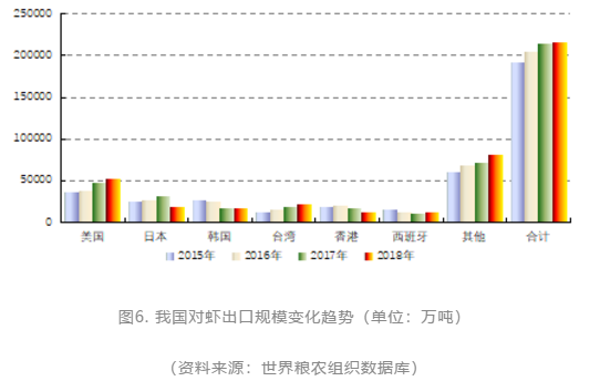 针对国际贸易形势,我国虾类出口企业近年来在市场多元化开拓方面不断努力,除了传统的美国、日本、欧盟和韩国4大传统出口市场,在北美、大洋洲和东盟均开拓了新的市场,如加拿大、墨西哥、澳大利亚、马来西亚、新加坡等,对这些新市场的出口少则6000-7000吨,多则达到万吨以上;然而受全球经济不景气影响,2018年继连续的增长之后仍表现出增长趋势放缓,从图6可以看出,不仅对美国的出口增长较前几年放缓,对日本、韩国和中国香港的出口也均出现了负增长。2019年的中美贸易战,更使我国虾类出口雪上加霜。