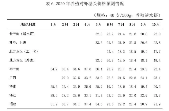 产业经济团队基于2017年~2019年各地塘口价的周(7天记录一次)价格数据,经整理加工后进行加权平均预测。选择的预测品种是40支/500g的养殖南美白对虾活水虾,这是养殖对虾中间具有代表性的规格。利用了采取距离预测年份越近赋权重值越高的思路。对于年度之间数据有部分缺失情况,采取权重值调整的办法处理;缺失数据较多的地区和月份放弃预测。