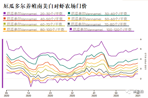 截至2021年第6周(2月8日至14日),20/30头HOSO虾的平均养殖场价格为$ 5.10 / kg;30/40头HOSO虾的平均价格为$4.00/kg;40/50头HOSO虾的平均价格为$3.60/kg;50/60头HOSO虾的平均价格为$3.30/kg;60/70头HOSO虾的平均价格为$ 3.15/kg;70/80头HOSO虾的平均价格为$2.95/kg;80/100头HOSO虾的平均价格为$2.75/kg; 100/120只虾为$ 2.50 / kg。