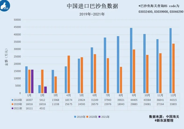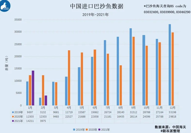 进口量方面,今年前两个月,巴沙鱼到港总量为1.82万吨,总体比2019年增长42%,比2020年下降26%。