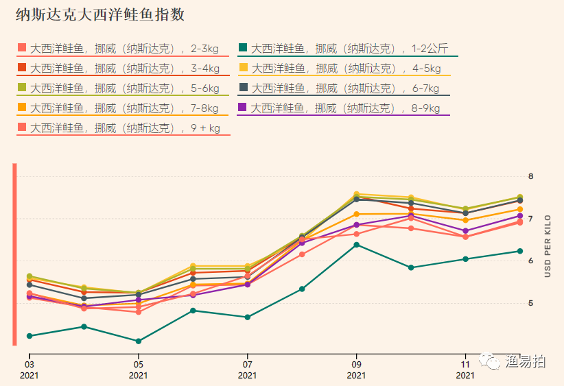 挪威4-5公斤:约合65挪威克朗/公斤,跌幅5挪威克朗