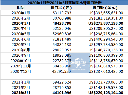 中国海关最新数据显示,受疫情影响,我国2021年第一季度冷冻暖水虾进口较去年同期下降13%,至13.5万吨,进口额约7.21亿美元,同比下降23%;3月份进口量同比下降15%。