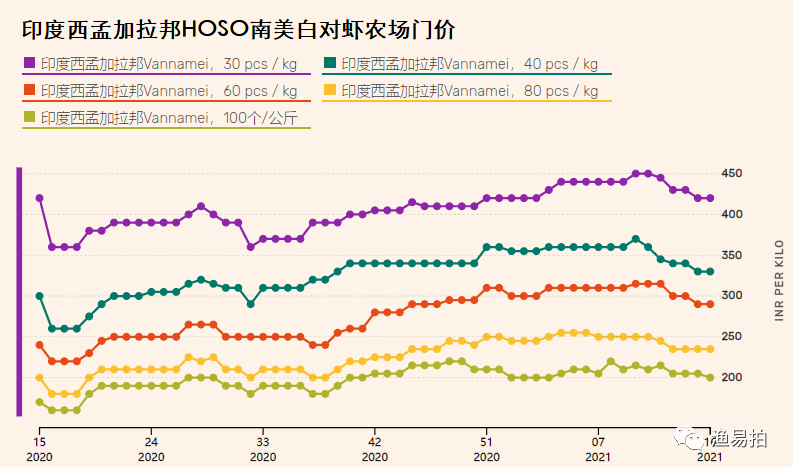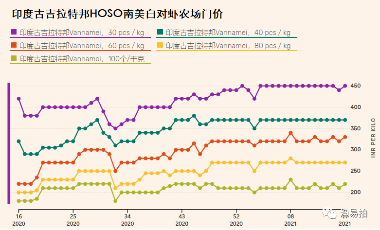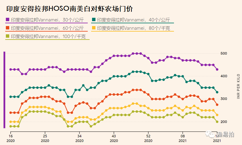 印度各地带头,带壳的南美白对虾的农场门价最新数据显示,在第17周的主要耕种地区安得拉邦,平均价格已降至今年的最低水平。