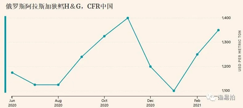 一位俄罗斯渔业行业高管警告说,随着欧洲买家补充库存,有些人可能会空手而归。“到欧洲的运费通常是每个集装箱1,500美元,现在是6,000美元。另一位大型加工商和出口商的高管表示:“没有迹象表明未来几个月内集装箱短缺状况将有所改善,这意味着不会有太多进出中国的原材料。” 第二位消息人士称,俄罗斯鳕鱼H&G价格坚挺至每吨$ 1,400,包括对中国的成本和运费,预计5月将升至$ 1,450 / t。因为俄罗斯A产季H&G原料产量下降了约11万吨。