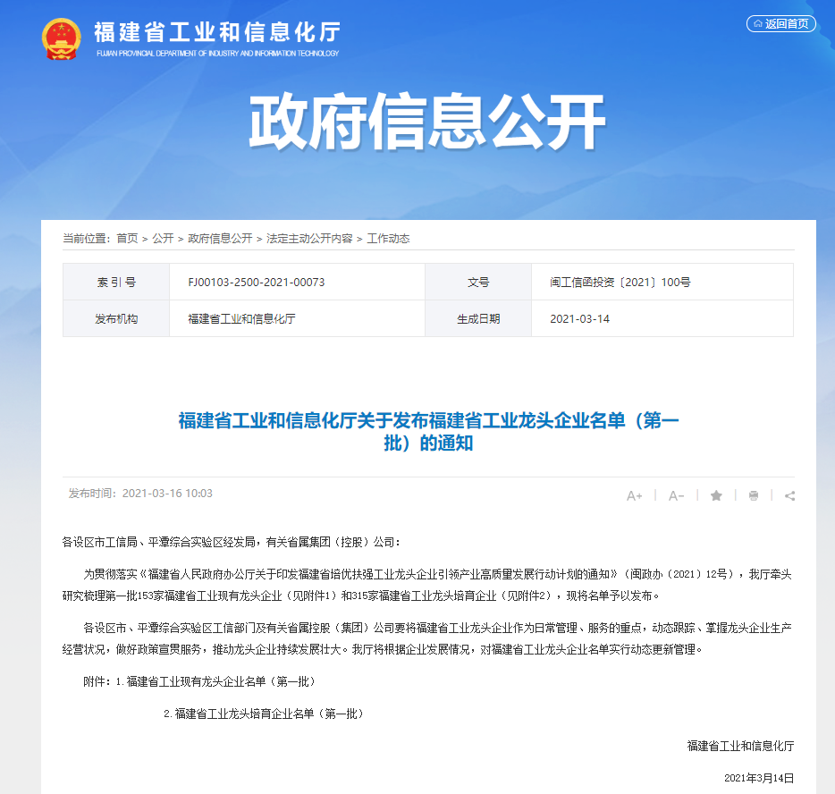 3月16日,福建省工业和信息化厅正式发布了《福建省工业龙头企业名单》,天马科技集团成功入选。据悉,本次获评企业是相关行业领域具有较大规模、较强实力、产业带动作用明显的重点骨干企业。此次天马科技集团被认定为“福建省工业龙头企业”,标志着集团的工业化建设水平已稳居行业前列,实现了从原料到生产到市场的全过程质量工业化把控,集团通过持续加大工业化建设投入,产品质量精益求精,生产效率更高,市场耦合度进一步提升。