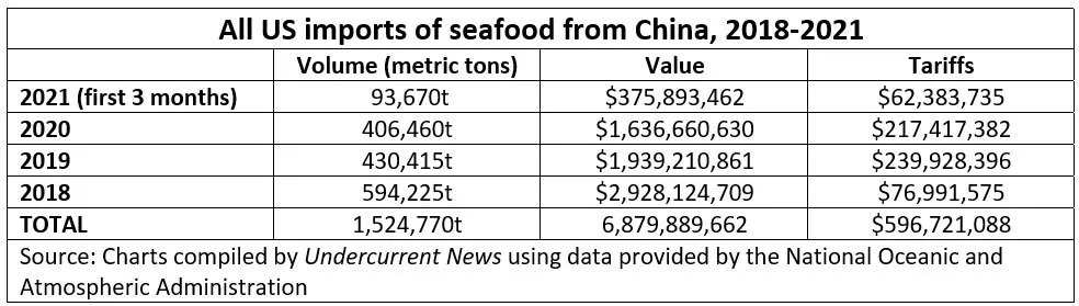 美国国家海洋与大气管理局(NOAA)统计,自2018年9月份中美贸易商波及海产品,直至2021年第一季度末,美国海产品进口商(也包括中国供应链)支付的关税多达5.97亿美元。拜登政府上台后,第一季度的关税总额也高达6,240万美元。