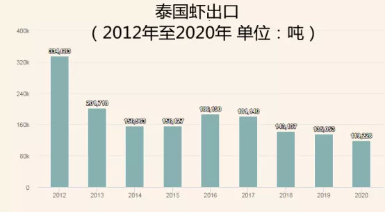 泰国的出口一直呈现下降趋势,更多的虾是在国内被消费。相关数据显示,2020年,泰国的虾出口量为11.9万吨,较2019年下降12%。与2012年相比,出口下降64%。泰国政府以健康原因为由拒绝进口印度和印尼白虾。
