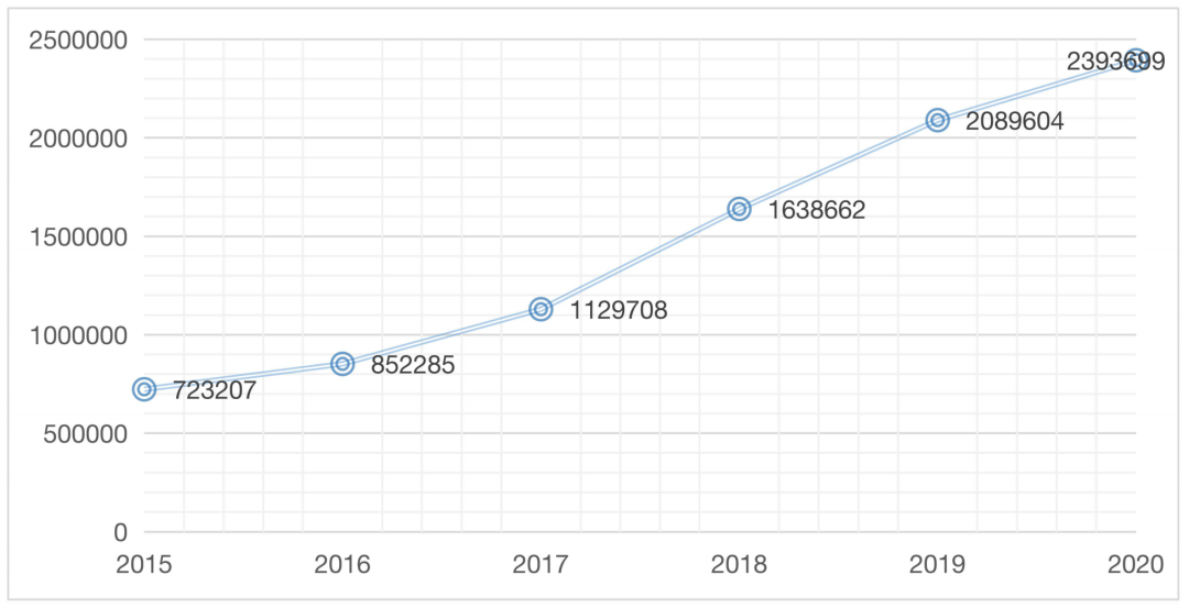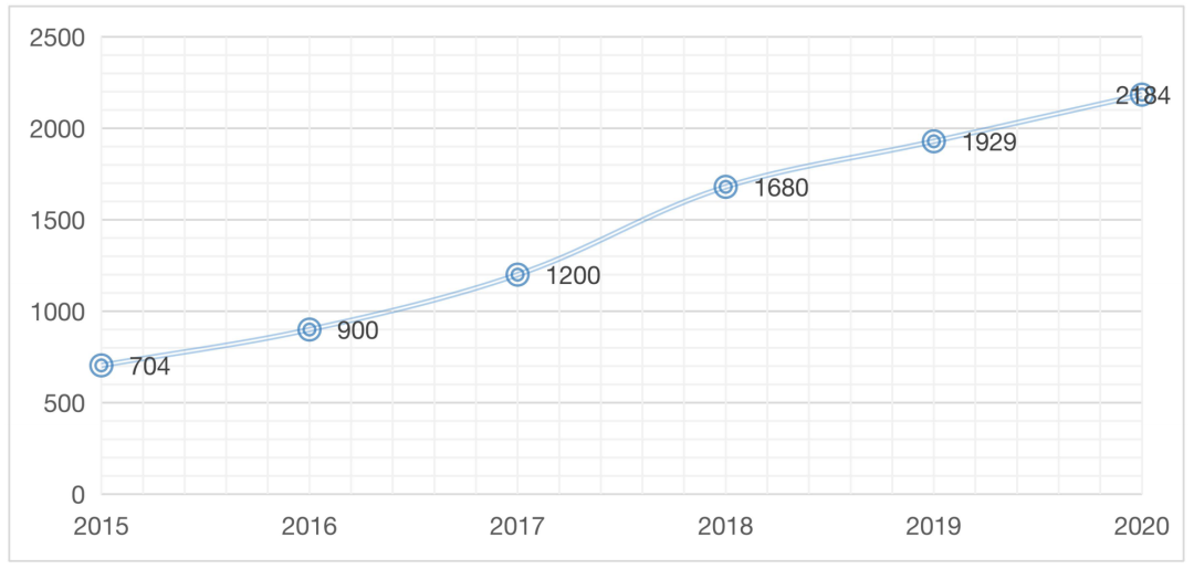 图3:2015~2020年小龙虾养殖总产量曲线图(单位:吨)
