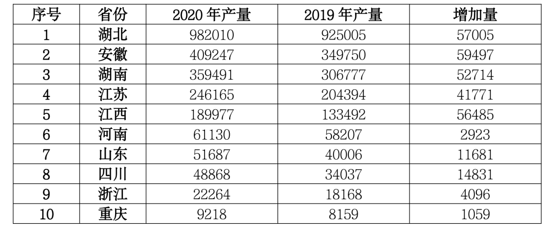 表1:2020年排名前10的省份小龙虾养殖产量(单位:吨)