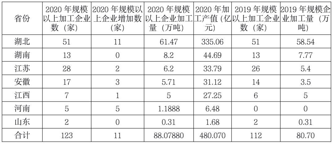 表3:2020年规模以上加工企业数量、加工量及产值统计数据