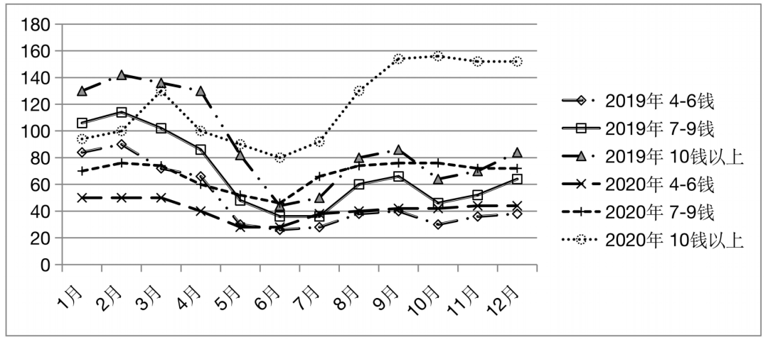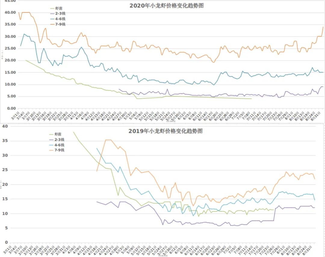 2020年,商品小龙虾价格走势仍然呈“U”型,3~4月小龙虾上市初期和7~8月小龙虾集中上市结束后价格较高,5~6月集中上市期间价格较低,总体而言,小龙虾价格同比偏低,大部分主产省全年综合平均价格同比下降10%~20%左右,且波动较往年更大。2020年,小龙虾价格走势最大的特点是规格影响小龙虾价格,且分化严重,大规格小龙虾价格略高于往年,而小规格小龙虾价格比往年偏低(见图4、图5、图6)。如安徽省,3月4~6钱的小龙虾约20~25元/斤,7~9钱的小龙虾约30元/斤;4月价格略有回落,4~6钱小龙虾约18~22元/斤,7~9钱小龙虾约25~28元/斤左右;5~6月4~6钱小龙虾价格降到11~12元/斤左右,7~9钱小龙虾约20~25元/斤。同时,小规格小龙虾价格则一直处于低位,4钱以下小龙虾长期处于10元/斤以下。此外,由于2020年年初新冠肺炎疫情阻断了市场,尤其是最大的小龙虾主产省湖北省灾情严重,而春季正是虾苗集中上市、开始种养生产的季节,导致虾苗价格暴跌。安徽省3月虾苗上市初期价格约15~17元/斤,4月下跌到5元/斤,且有价无市;而2019年同期一般在25~38元/斤,而且供不应求。