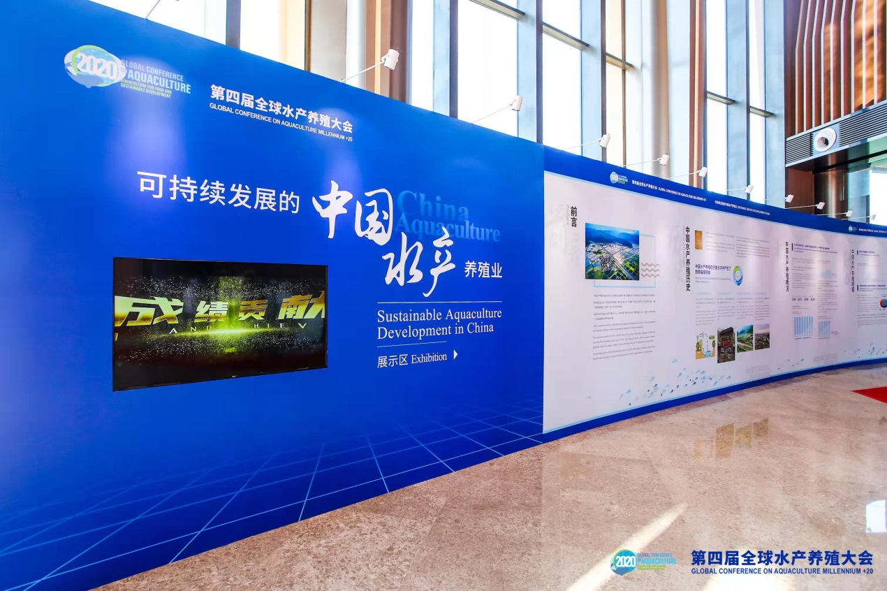 大会设置“可持续发展的中国水产养殖业”展示区,由我会具体负责。展示由图文展和实体展两部分构成。其中,图文展由全国水产技术推广总站统稿,我会负责展示效果设计和现场搭建,最终以一面长40米、高4米的一体曲面展板系统展示了中国水产养殖业发展历史、概况、规模、贡献、模式、科技、教育、推广、政策法规、国际合作等内容,展现了中国政府围绕实施乡村振兴战略,坚持水产养殖业绿色高质量发展,持续为全球渔业发展贡献力量的决心、态度和行动。丰富的内容、简约的设计得到与会者的高度好评。