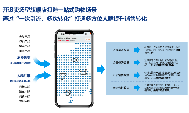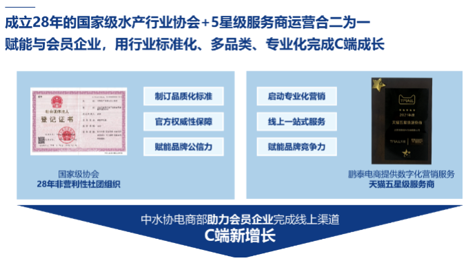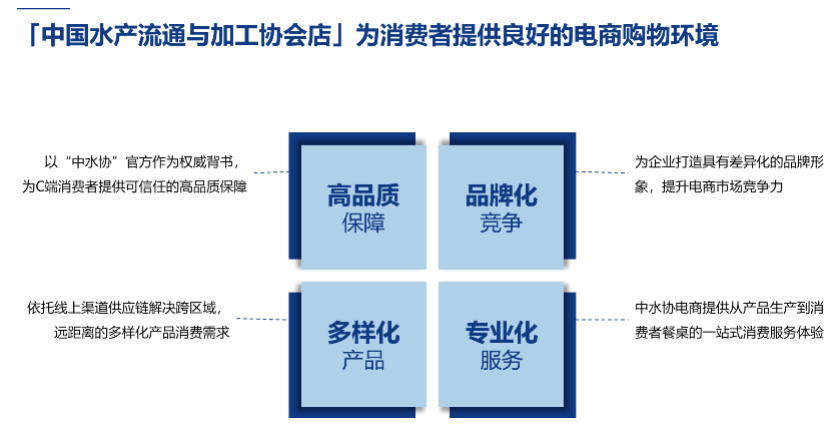 为更好地服务企业,提升水产品品牌影响力,为消费者提供安全放心可追溯的高品质水产品,2021年10月26日,中国水产与流通加工协会在天猫平台开通运营「中国水产流通与加工协会店」,按照高品质、严要求,严选企业品牌产品入驻,打造天猫唯一卖场型水产品线上旗舰店,向消费者提供高品质水产品。协会致力于拓展优质水产品电商销售渠道,宣传推广优质企业品牌,引领水产品电商行业规范化发展。