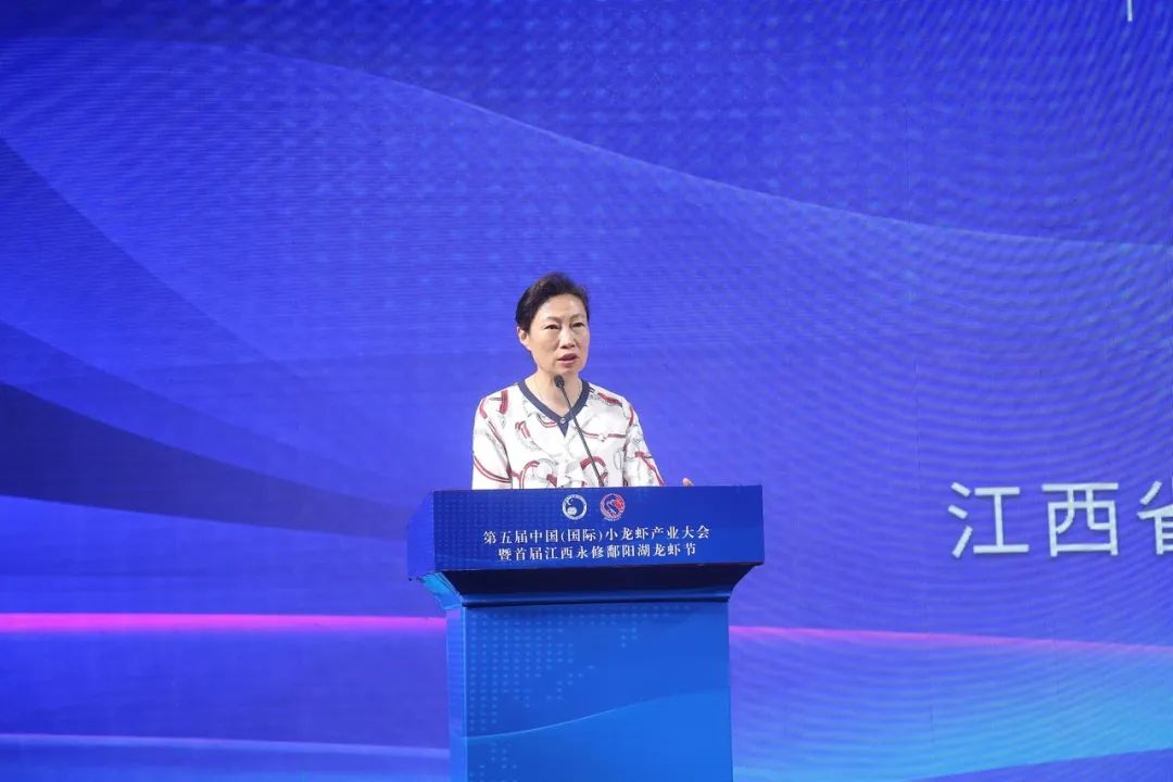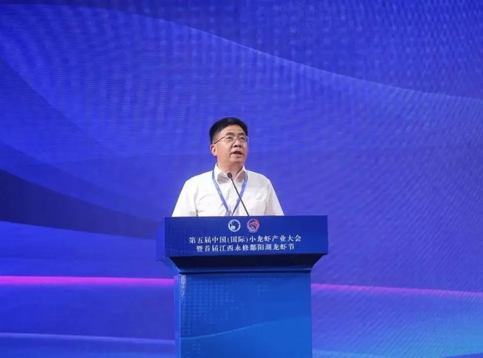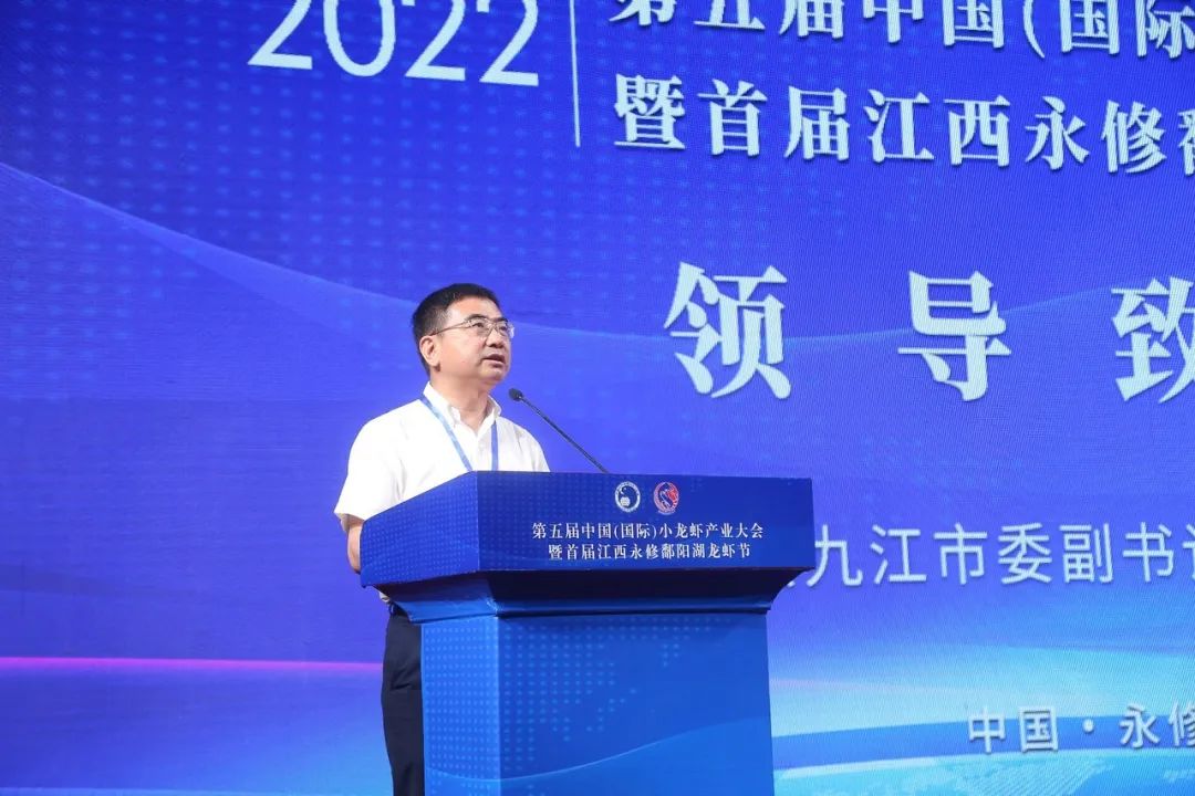 中共九江市委副书记蒋文定在致辞中谈到,九江是沿江最早对外开放的城市,江西省唯一通江达海的港口城市。九江水域面积500万亩,全省152公里长江岸线和鄱阳湖2/3的水域面积都在九江,全市养殖面积150万亩,万亩以上湖泊有9个,渔业资源十分丰富。在渔业发展方面,九江聚焦“建设现代渔业强市,打造虾蟹产业名城”目标,以做大做强“鄱阳湖虾蟹”产业为切入口,大力推广新技术新模式,发展新型经营主体,支持壮大龙头企业,形成了沿江环湖的鄱阳湖虾蟹、彭泽鲫等优势产业带和产业集群。今年全市小龙虾养殖面积达50万亩,其中千亩以上养殖基地21家,预计全年产量9万吨,产值超27亿元,占渔业总产值的24.5%。