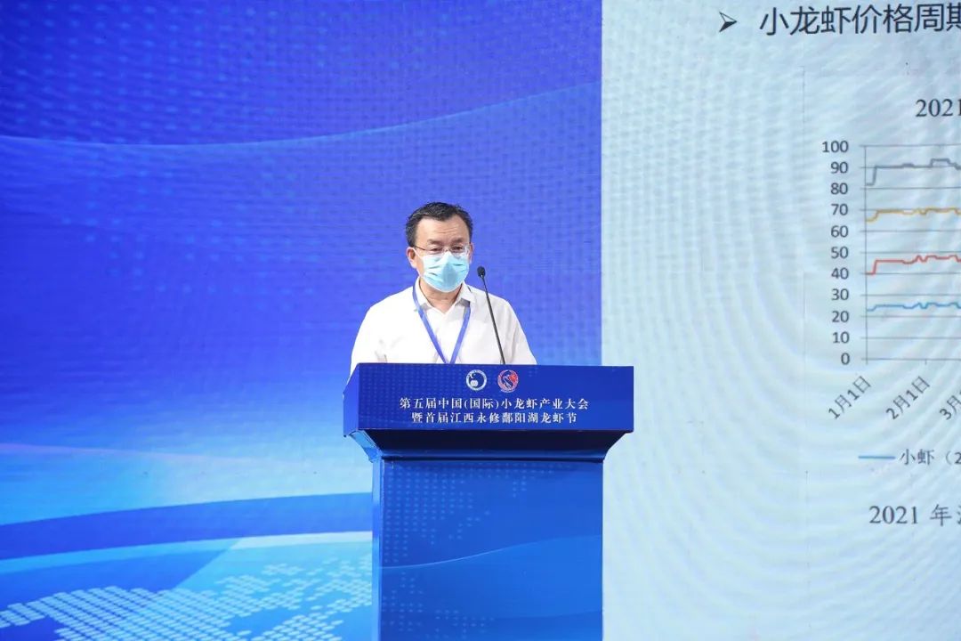 江西省农业农村厅党组书记、厅长江枝英在致辞中介绍了江西省小龙虾产业现状。截至目前,江西省小龙虾养殖面积249万亩,养殖产量25万吨,一产产值达90亿,综合产值达300亿,产业发展稳居全国第一梯队。技术模式不断成熟,坚持以“不与人争粮,不与粮争地”为基本原则;产业链条不断延伸,全省现有规模化小龙虾苗种繁育基地200个,各类小龙虾加工企业20家,年加工能力达10万吨,在优势产区建成综合性交易平台20余个,2021年小龙虾全产业链年新增产值达20亿元以上;品牌效应不断凸显,全省现有鄱阳湖品牌小龙虾专卖店210余家,每年营销小龙虾及其产品3万余吨。