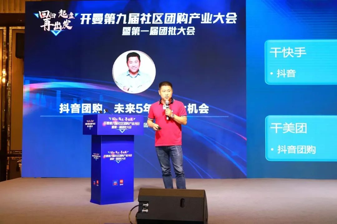 窝窝团创始人王赟明介绍自己时说,他的社区团购之路是从烟台老家帮老爸卖海鲜开始的。针对抖音近日开辟团购外卖业务,他带来的主题分享时《抖音团购,未来五年的最大机会》。他表示,抖音现在日活八亿用户,用户年龄覆盖8个月到80岁,业务板块覆盖短视频、头条、团购、商城,正在全面进军本地生活服务领域,商业潜力巨大!