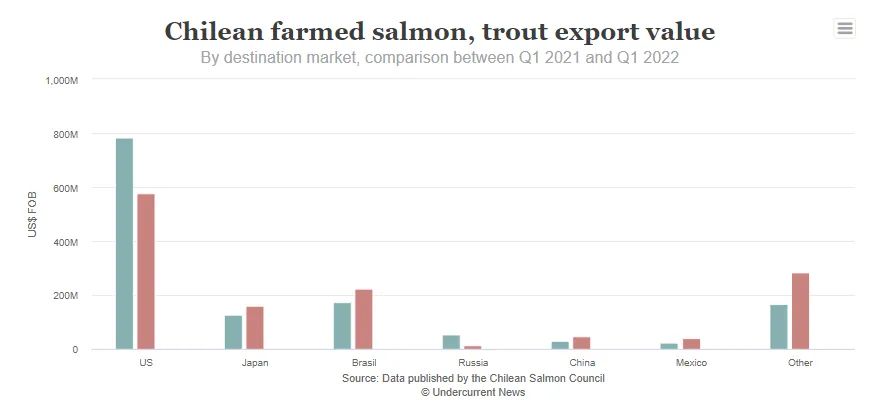 智利三文鱼协会(Chilean Salmon Council)统计,2022年第二季度,智利出口161,303吨鲑鳟鱼类,出口额15.5亿美元,量额分别同比增长2.7%、34%。
