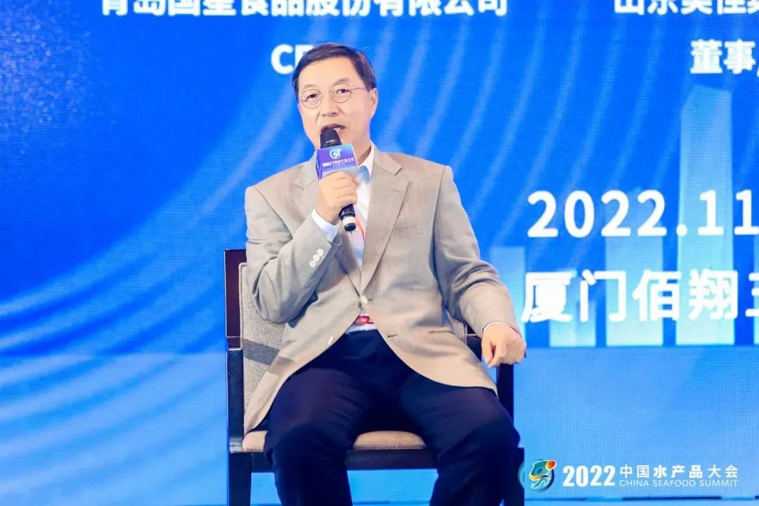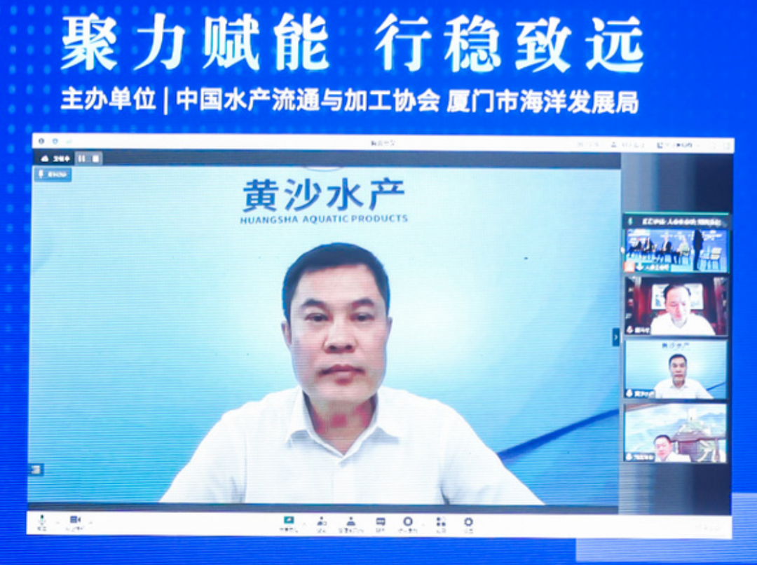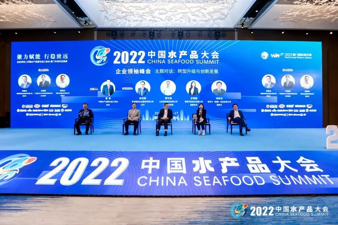 以“转型升级与创新发展”为主题的对话环节,崔和会长主持,与青岛国星食品股份有限公司CEO张志刚、海南翔泰渔业股份有限公司董事长刘荣杰、海欣食品股份有限公司董事长滕用庄、山东美佳集团有限公司副总裁费守成、广州黄沙水产交易市场有限公司执行董事许晓帆、蓬莱京鲁渔业有限公司副董事长王明丽、蛤老大(福建)食品有限公司董事长林秋云等7位行业领军企业负责人就双循环、大市场、科技引领、产品创新、品牌建设等话题展开了深入且富有成效的讨论。