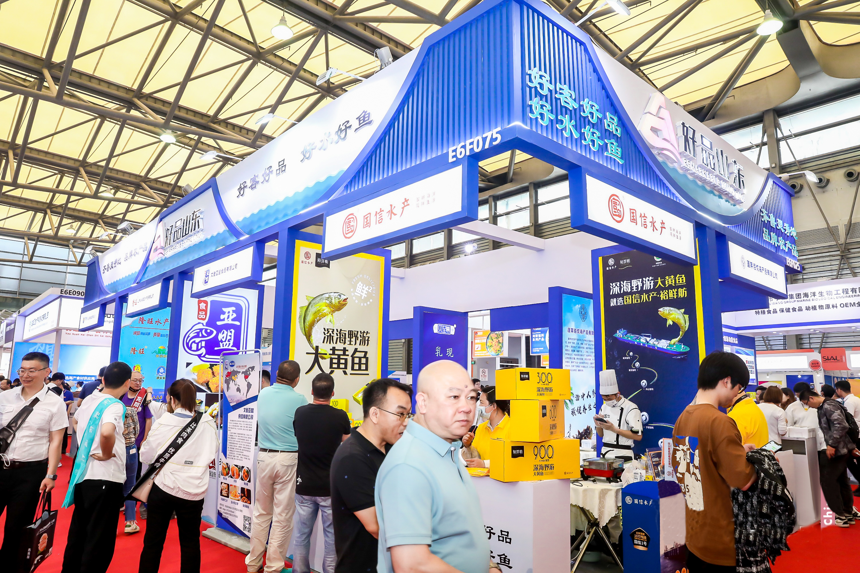在为期三天的展会中,位于上海浦东新国际博览中心E6馆F075展位的“好品山东”水产展示区一片热闹景象,海洋馈赠的威海刺参、乳山牡蛎、滨州文蛤、沾化海蜇、深海黑鲪、深海鲈鱼、深海野游大黄鱼等100多种产品,不仅每天圈粉不断,引来众多国内外采购商驻足洽谈,还得到媒体记者、探展直播团队的关注,让“好客好品 好水好鱼”这张山东渔业新名片传播得更远。展示区作为展示山东优质海水产品的平台,从威海、青岛、日照、滨州、烟台五市精心甄选出8家渔业品牌企业参展,综合运用精品展览、现场烹饪试吃、视频图文播放等方式,突出展示“好客山东”有“好品”,“好品山东”出“好鱼”,与国内外共享山东“蓝色粮仓”的独特魅力。