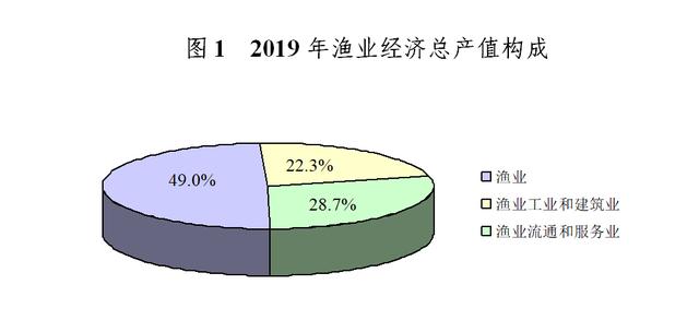 按当年价格计算,全社会渔业经济总产值30873.14亿元,其中,渔业产值15267.49亿元,渔业工业和建筑业产值6621.17亿元,渔业流通和服务业产值8984.48亿元,三个产业产值的比例为49.5∶21.4∶29.1,如图1所示。渔业流通和服务业产值中,休闲渔业产值847.40亿元,同比上升1.42%。