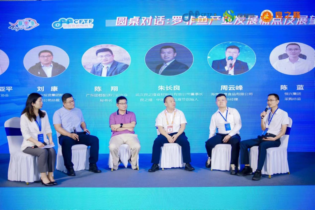 由中国水产流通与加工协会副秘书长朱亚平主持,对话嘉宾为武汉良之隆食材股份有限公司董事长、良之隆·中国食材电商节创始人朱长良,广东团餐配送行业协会秘书长陈翔,百洋产业投资集团股份有限公司总裁刘康,海南勒富食品有限公司总经理周云峰,恒兴集团采购总监陈蓝。就目前罗非鱼产业发展痛点及展望进行了沟通讨论,分别从罗非鱼产业端、加工出口市场转内销、餐饮团餐、供应链、产品研发等方面进行精彩的讨论,产业端分享了公司对罗非鱼整体布局和未来规划、餐饮端指出罗非鱼从营养价值和无刺等方面很适合团餐、儿童餐、校园餐、从供应链端来说罗非鱼还需要加大力度研发出市场的爆品。通过近1个小时的圆桌对话,罗非鱼国际贸易仍然要稳抓,内循环需加大合作和产品得研发,让罗非鱼这条“21世纪之鱼”有更好发展前景。