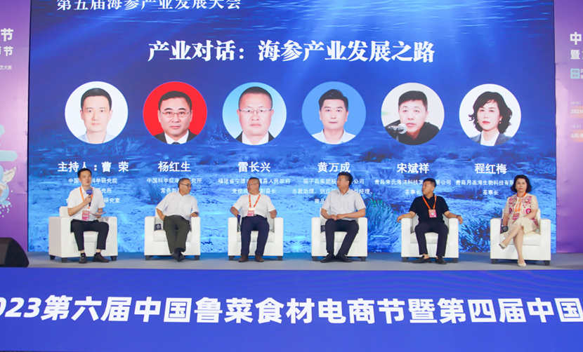 大会产业对话围绕“海参产业发展之路”这一主题展开,由中国水产科学研究院黄海水产研究所食品工程与营养研究室曹荣主任主持。五位对话嘉宾分别为中国科学院海洋牧场工程实验室主任杨红生研究员、福建省宁德市霞浦县人民政府党组成员雷长兴副县长、獐子岛集团股份有限公司总裁助理黄万成先生、青岛宋氏海洋科技发展有限公司宋斌祥董事长、青岛月亮湾生物科技有限公司程红梅董事长。