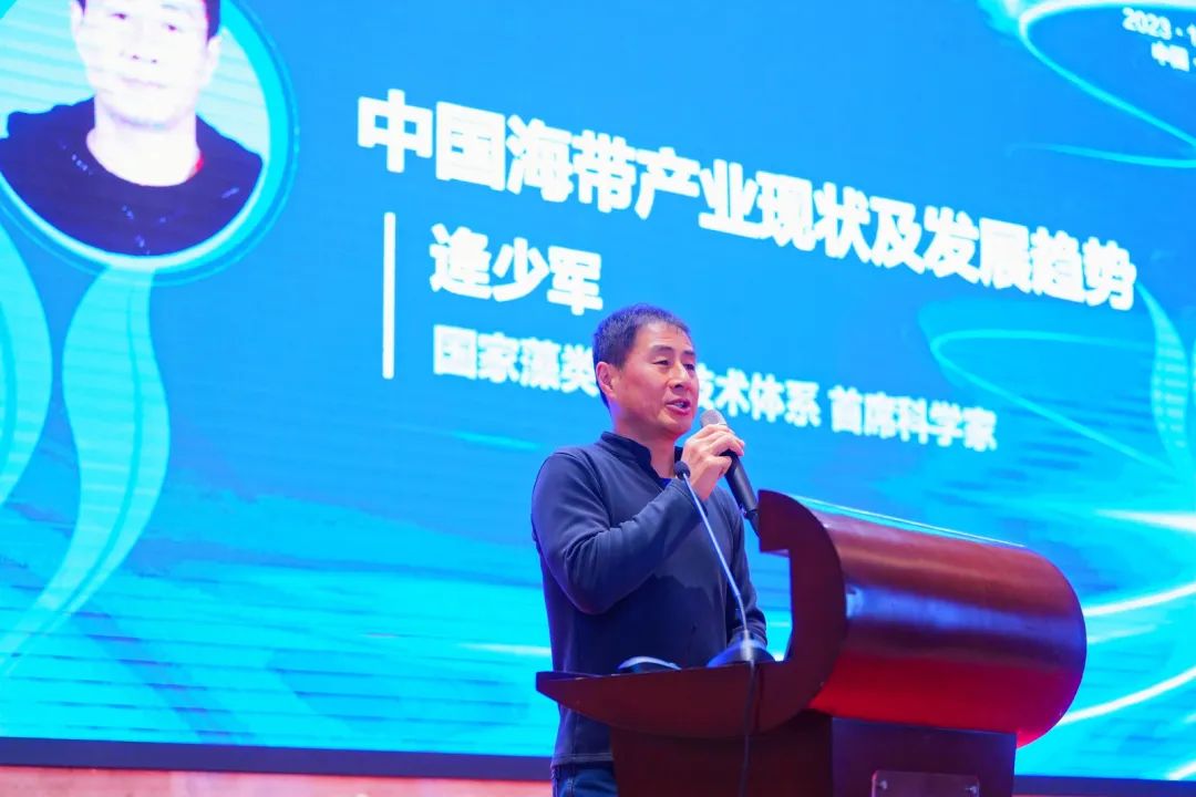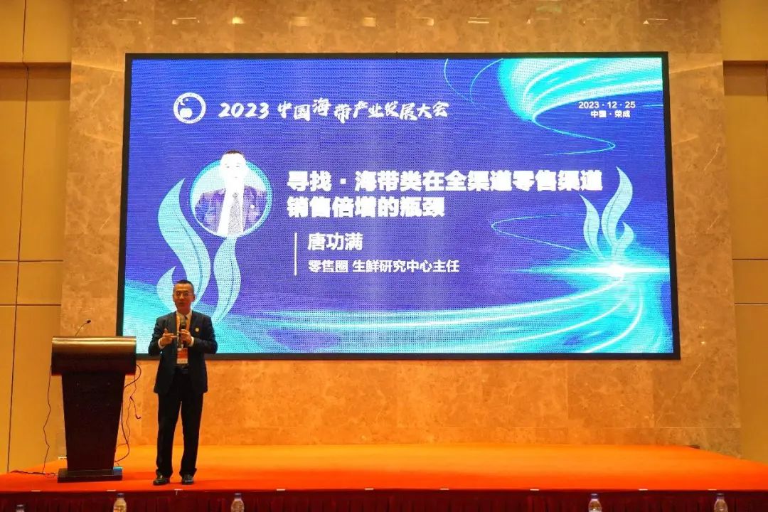 山东省农业农村厅郭鹏总农艺师在致辞中介绍山东省积极构建产学研合作体系,不断探索海带产业发展新模式和新路径。威海荣成海带被列入2023年农业品牌精品培育名单,是全国首批上榜的藻类水产品,也是山东省唯一上榜的藻类水产品牌。借助本次大会,希望大家能够聚焦海带产业痛点难点,携手推进产业发展,实现海带产业高质量可持续发展。