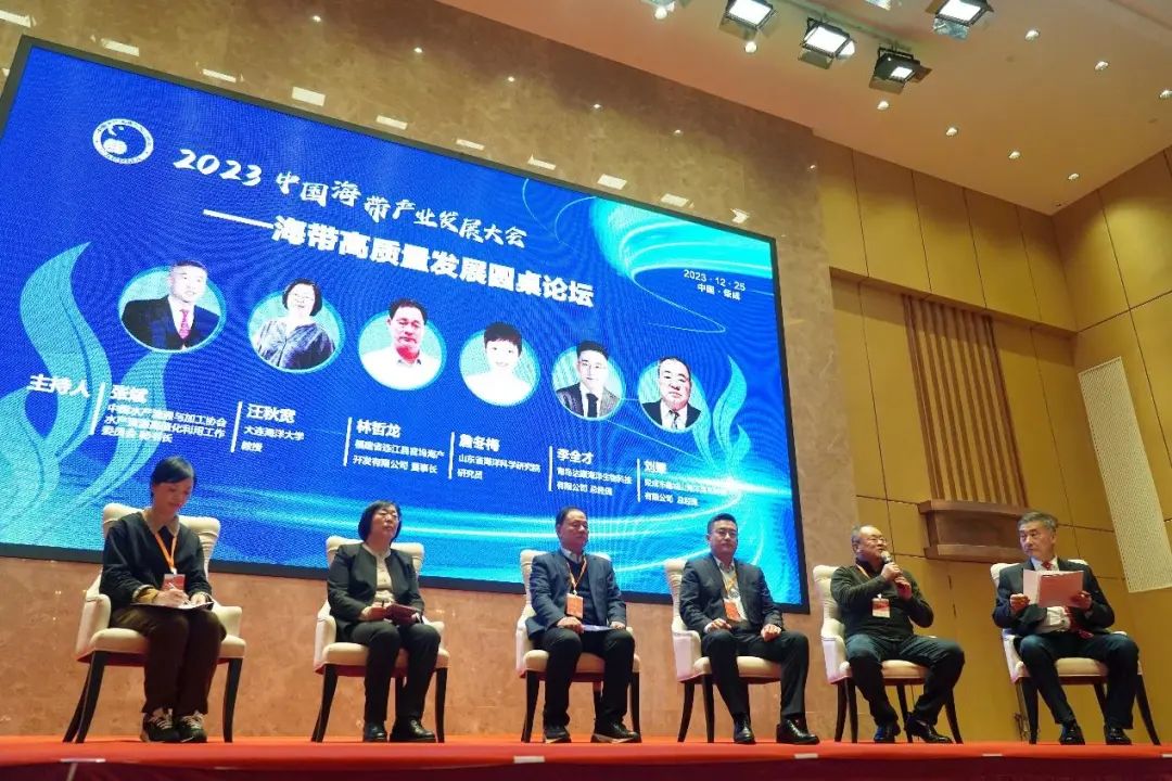 圆桌论坛以推动海带产业高质量发展为主题展开对话。中国水产流通与加工协会水产资源高值化利用工作委员会秘书长、青岛博智汇力生物科技有限公司董事长兼总经理 张斌主持该环节,大连海洋大学汪秋宽教授、福建省连江县官坞海产开发有限公司林哲龙董事长、山东省海洋科学研究院研究员、山东省藻类产业技术体系首席岗位专家 詹冬梅、荣成市鑫城山海洋昆布科技有限公司刘翚总经理、青岛达康海洋生物科技有限公司李全才总经理分别从科学研究和企业经营的角度分享了在海带育苗、养殖、加工、销售及高值化利用等方面开展的工作,取得的成效和遇到的问题,对产业未来发展提出了期许和建议。