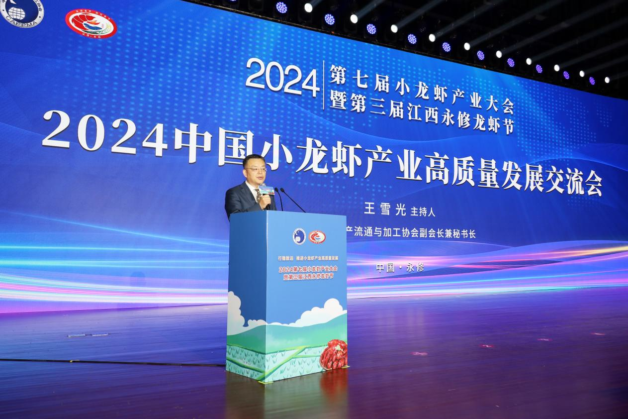 永修县委书记秦岭致欢迎辞,并介绍永修县小龙虾产业现状。他讲到,永修县首创“农田种养一张图”模式,小龙虾种养面积突破26万亩,稳居全省同级别县(市、区)中首位;拥有全省最大的小龙虾交易市场,高峰期日均交易量突破200吨;第一批预制菜加工项目全面投产,年加工产能达3万吨以上,促使“永修龙虾”从季节“网红”变成全年“长红”;冷链物流全面升级,16小时内即可抵达全国500多个城市;2023年,大力发展龙虾垂钓、餐饮、休闲观光等多元消费业态,精心打造了“虾客天下”美食街,开设了永修龙虾南昌旗舰店,开通了小龙虾定制免费公交,持续点亮夜间经济,到永修吃虾已成为一种新风尚。永修县已形成集养殖、集散、加工、流通、餐饮、旅游等各环节于一体的全产业链。