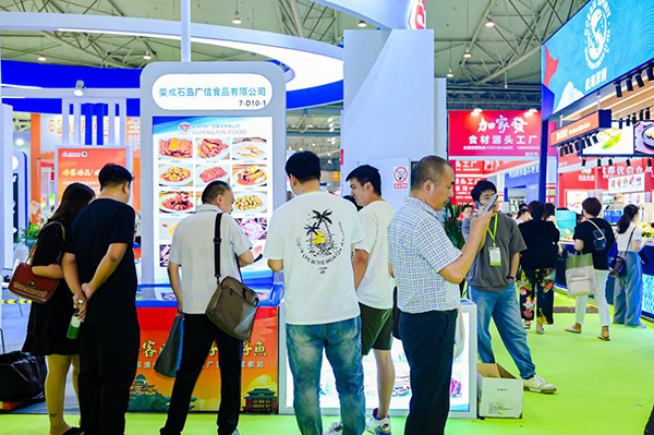本次活动围绕“好客好品 好水好鱼”主题,融入了产品展示、品鉴交流、市场考察、供采对接、工作会议等多种活动形式。为让各地采购商品尝到地道的山东“好品”“好鱼”,在成都世纪城新国际会展中心7号馆的“好客好品 好水好鱼”水产展示区内,威海、烟台、日照、青岛等七市遴选推荐出的8家实力、口碑兼具的渔业品牌企业,也都择优带来了各自生产的明星产品。百余种优质鲁鲜汇聚展区,可谓是琳琅满目,色香味俱全。从荣成石岛广信的“石岛味道”捞汁小海鲜,枣庄海河食品的“香滋来”龙虾仁,山东海航的“海来鑫”即食海参、海蜇,到青岛国信的“国信水产·裕鲜舫”深海野游大黄鱼,山东荣信水产的“荣信渔场”麻辣鲍螺、刺身甜虾,蓬莱汇洋的“京鲁远洋”深海鳕鱼排,再到东营尚牧的“牧渔归”刺身级生蚝、无沙白蛤,威海藻领鲜的“藻领鲜”荣成海带、裙带……每个企业的试吃桌前都吸引着不少采购商驻足品尝、交流洽谈。