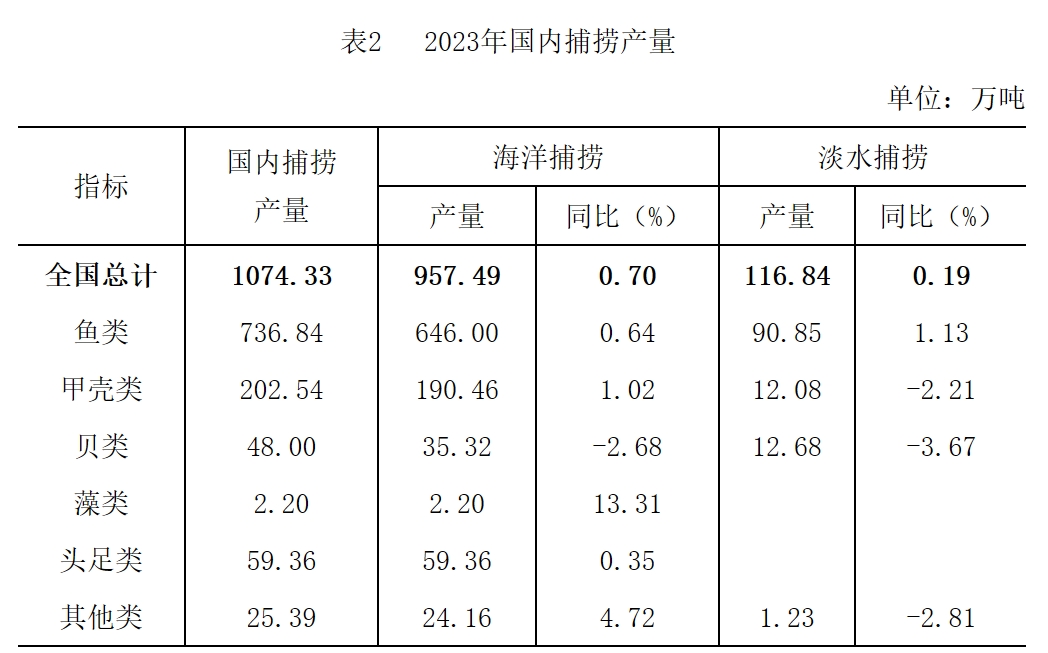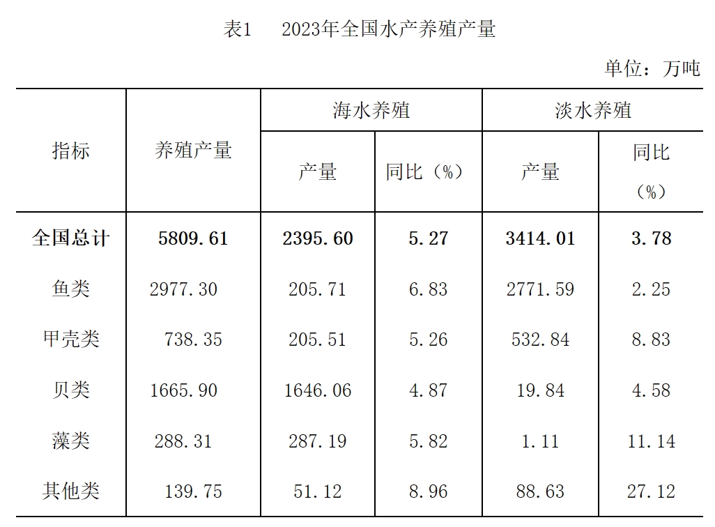 2023年,全国水产品总产量7116.17万吨,同比增长3.64%。其中,养殖产量5809.61万吨,同比增长4.39%;捕捞产量1306.56万吨,同比增长0.47%;养殖产品与捕捞产品的产量比例为81.6:18.4,如表1、表2所示。海水产品产量3585.32万吨,同比增长3.64%;淡水产品产量3530.85万吨,同比增长3.65%;海水产品与淡水产品的产量比例为50.4:49.6。