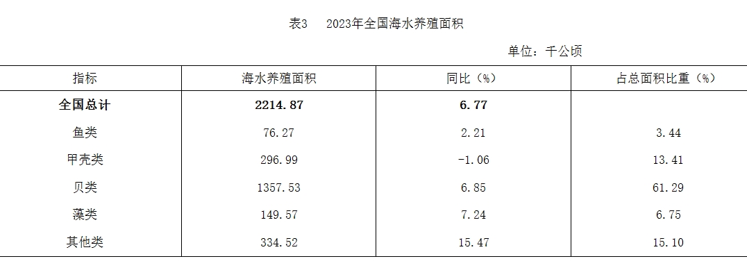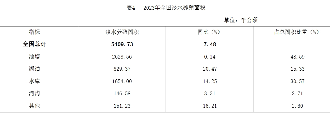 2023年,全国水产养殖面积7624.60千公顷,同比增长7.28%。其中,海水养殖面积2214.87千公顷,同比增长6.77%;淡水养殖面积5409.73千公顷,同比增长7.48%;海水养殖与淡水养殖的面积比例为29.0:71.0,如表3、表4所示。
