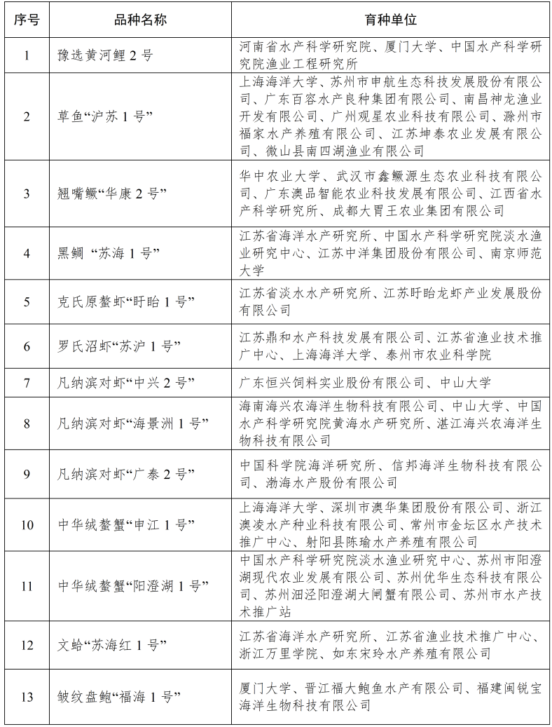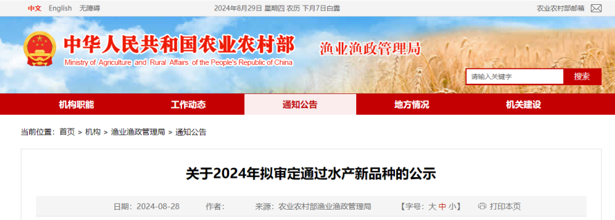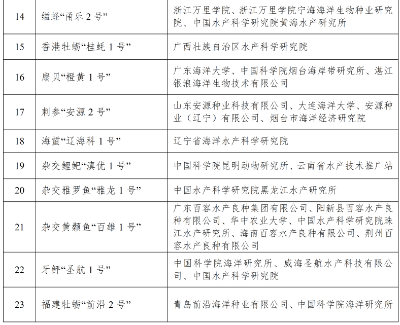 农业农村部渔业渔政管理局公示2024年拟审定通过的23个水产新品种