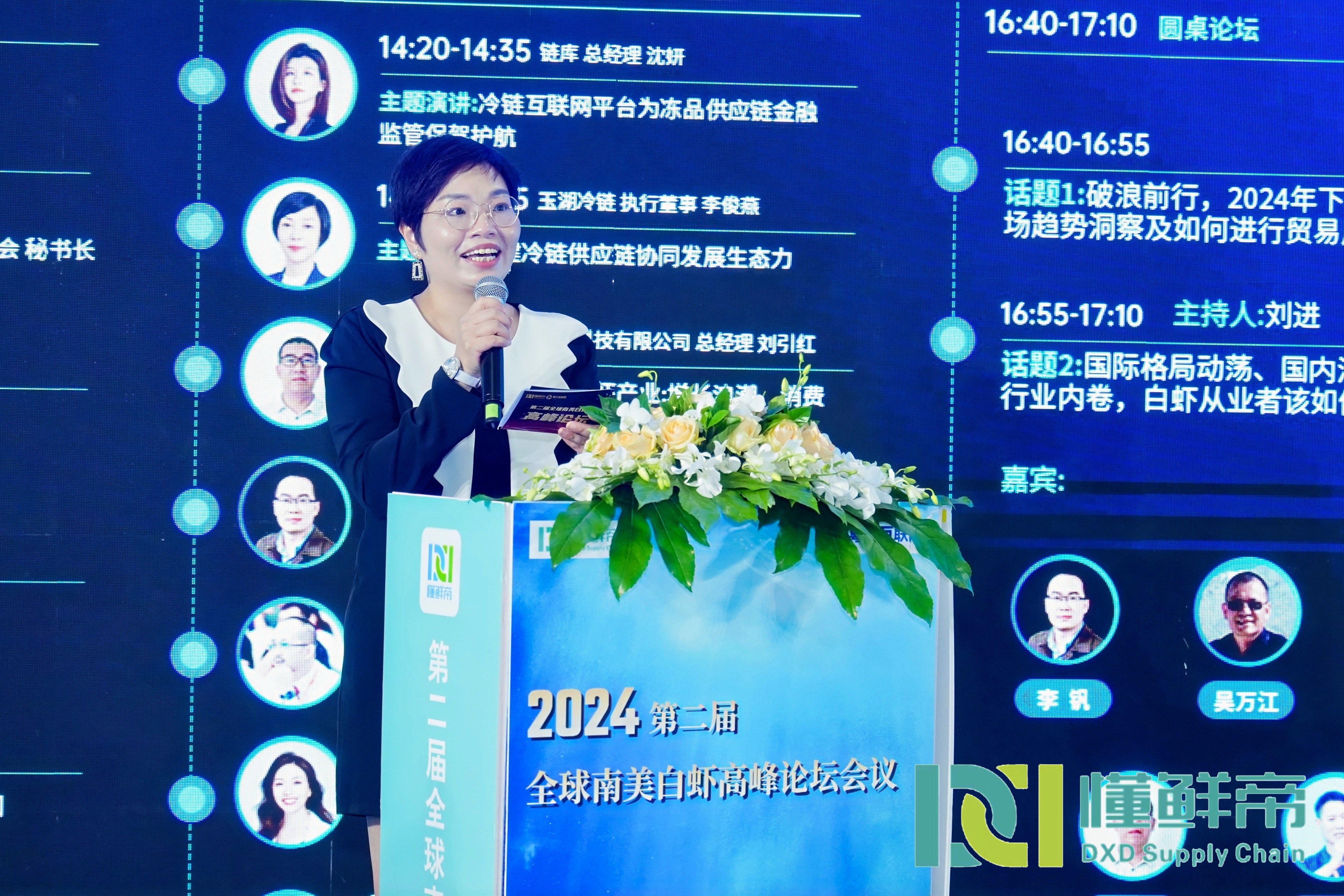 会议邀请链库总经理沈妍、玉湖冷链执行董事李俊燕、华厨科技有限公司总经理刘引红、“养虾世界”自媒体创始人兼主编李钒、懂鲜帝创始人兼CEO金煌、北海速虾记食品有限公司总裁刘晓红、粤十供应链总经理潘泓宇分别就”冷链互联网平台为冻品供应链金融监管保驾护航,共建冷链供应链协同发展生态力,2024南美白虾产业增长浪潮、消费新态与潜力探秘,南美白虾国产养殖现状及发展机遇,南美白虾产地养殖及国际贸易的新变革,虾类品牌打造创新新思路,如何助力南美白对虾与供应链金融共生共荣等话题做主题演讲。