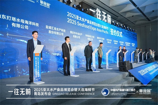 签约仪式上,威海市宇王集团有限公司董事长苗强、大连天正实业有限公司副总裁王常玉、申和食品(大连)有限公司董事长蒋小兵、大连浩和食品有限公司董事长刘雍、肇庆市中业水产有限公司董事长谢海、蓬莱京鲁渔业有限公司副董事长王明丽、盐城汇佳水产科技股份有限公司总经理陆暘捷、江苏海福特海洋科技有限公司销售总监刘杰、山东灯塔水母海洋科技有限公司营销总监侯斌、福建亿达食品有限公司总经理邱威杰作为十家首发签约企业代表上台签约,标志着国内水产企业正式与博览会组委会携手,共同为亚太地区水产行业高质量发展贡献力量。随着龙头企业的参展,博览会核心竞争力、品牌价值和影响力进一步提高,定能带动行业中更多的水产企业加入进来,共创新未来!