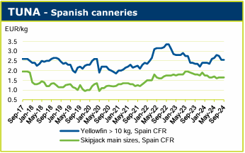 大西洋的渔获再次回落至较低水平。当地罐头厂原材料库存紧缺,鲣鱼价格略有上涨,而供给紧缺的黄鳍金枪鱼价格仍然很高。