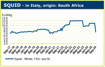 在南非的鱿鱼捕捞季结束后,由于几个集装箱的货物未能及时装运导致延迟发货,在价格下跌后才交付给欧洲客户。这意味着买家重新就价格进行谈判,大规格鱿鱼的价格下降了3欧元/千克。目前,价格仍有所波动,尽管货运成本更低,但许多出口商仍不愿接受价格大幅下跌。由于捕捞季重启状况良好,但随后由于冬季的来临,供需处于不平衡状态。
