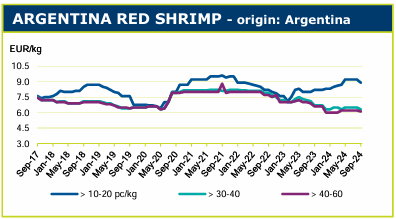 目前欧洲市场上虽然对于对虾的需求量很大,但由于捕捞量巨大,阿根廷红虾的价格在过去几个月里已经下跌了0.60欧元/千克。